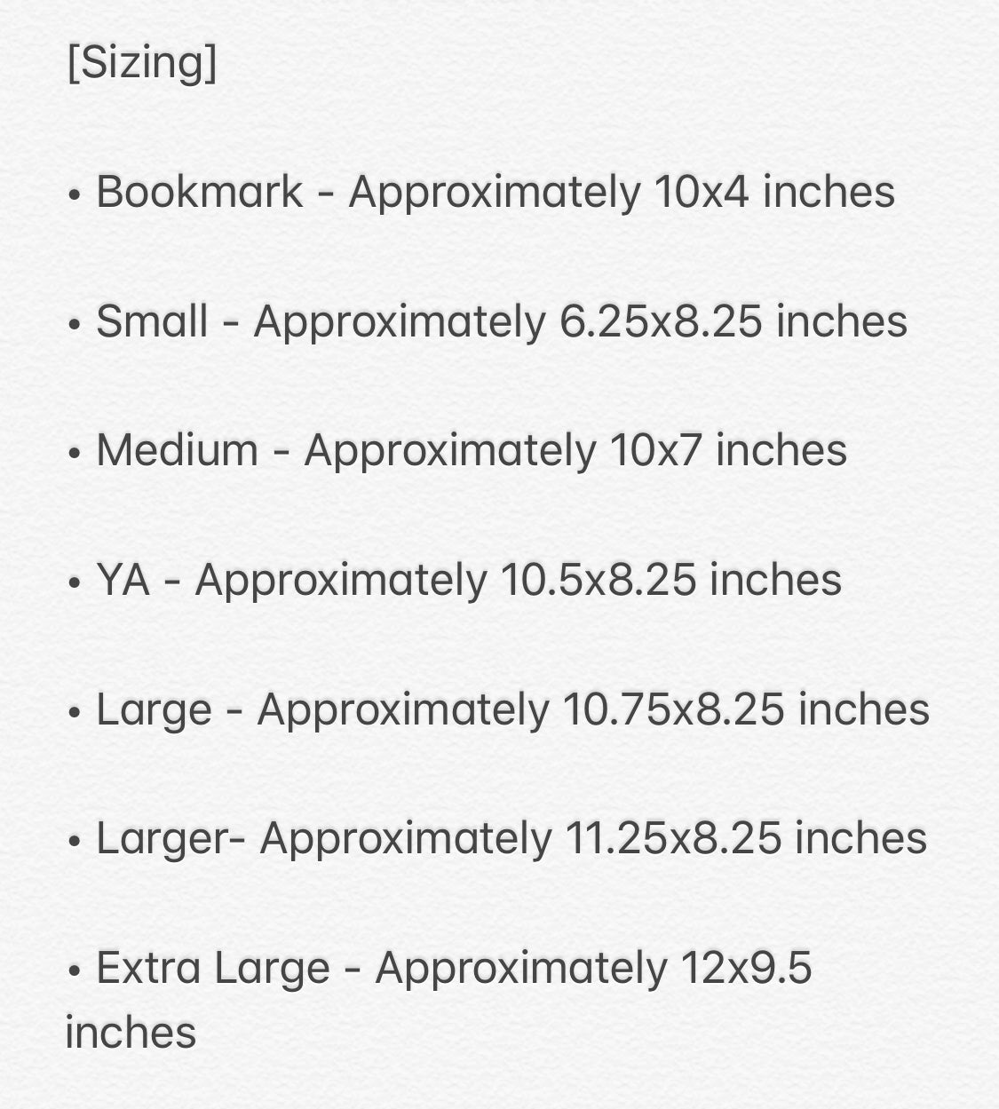 • YA - Approximately 10.5x8.25 inches and fits larger paperbacks and most standard YA hardback books.